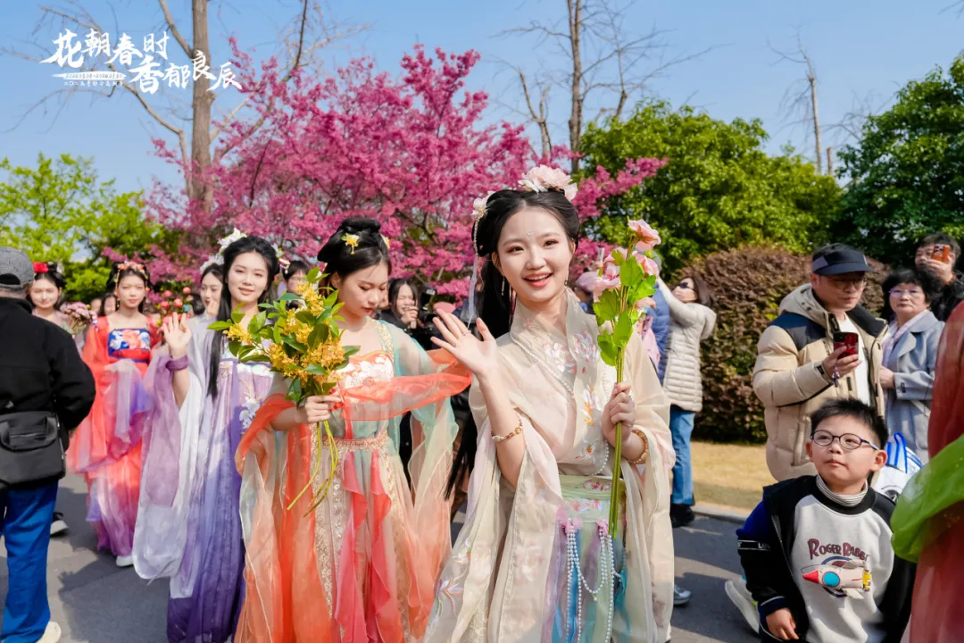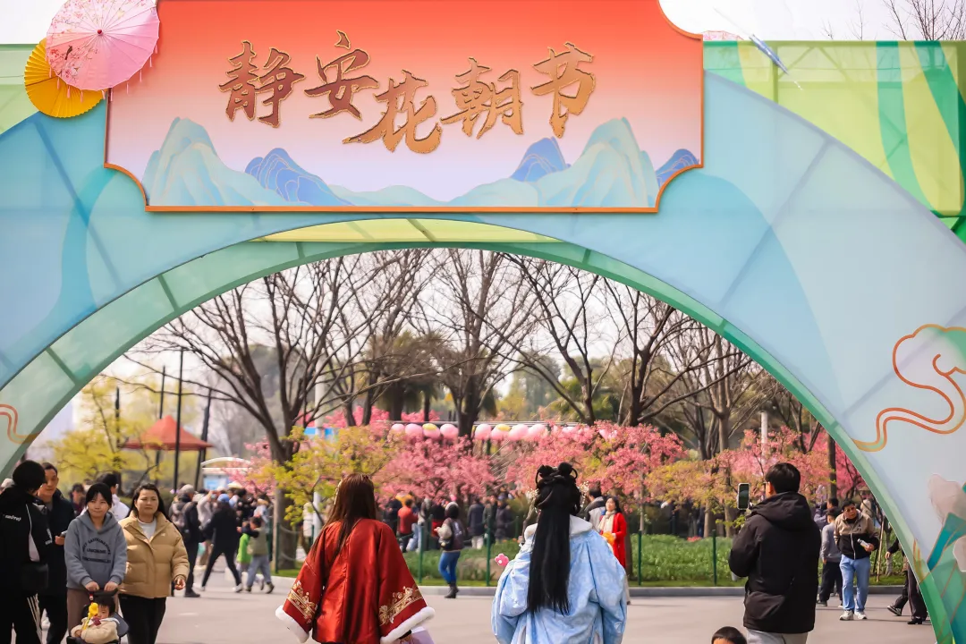 在百花盛放之际,以华服巡游、国风会演主题市集、NPC互动等演绎方式,绵延千年花朝文化,2025年静安花朝节以“花朝春时,香郁良辰”为主题,以郁金香、樱花、海棠、白玉兰的天然花期为序,贯穿整个仲春时节,自3月8日拉开帷幕以来,已经吸引了海量市民游客前来踏青游春、共飨春日繁花盛宴。