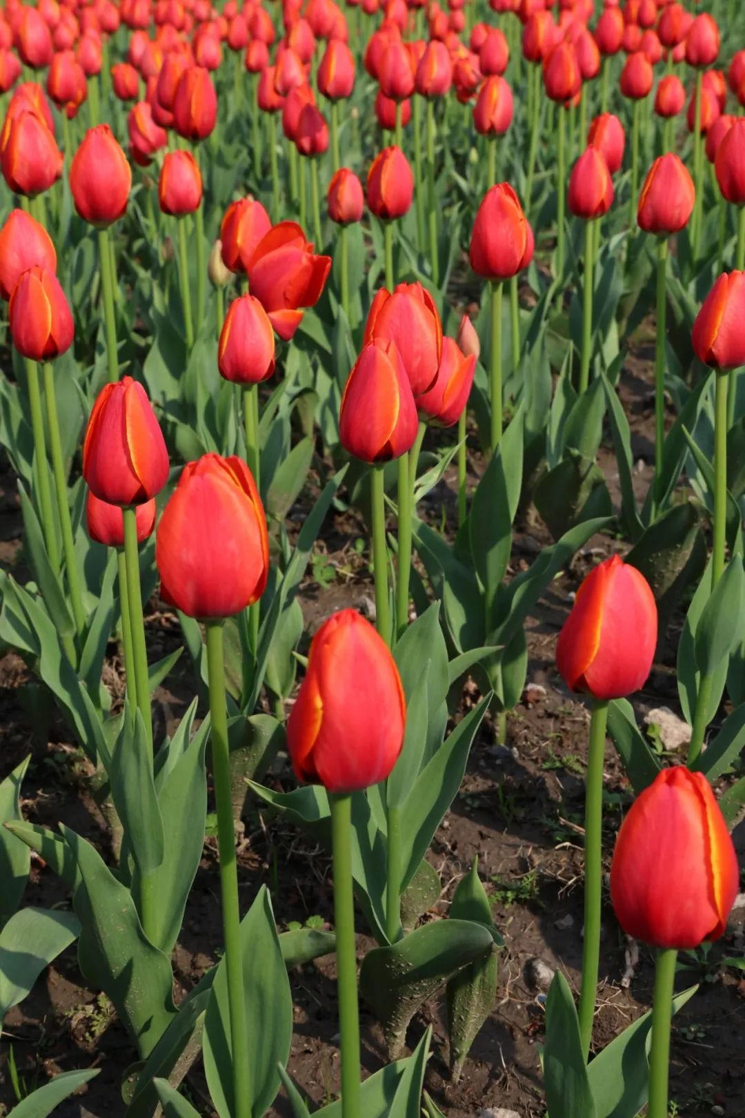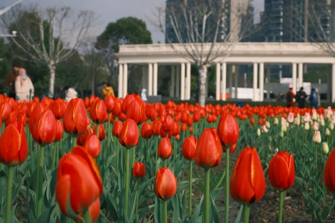这片花田紧挨罗马广场,以艳丽夺目的红色郁金香为主,花朵有的含苞待放,有的绽放得正热烈。在红色花海的衬托下,罗马广场的乳白色建筑也更具典雅风情。
