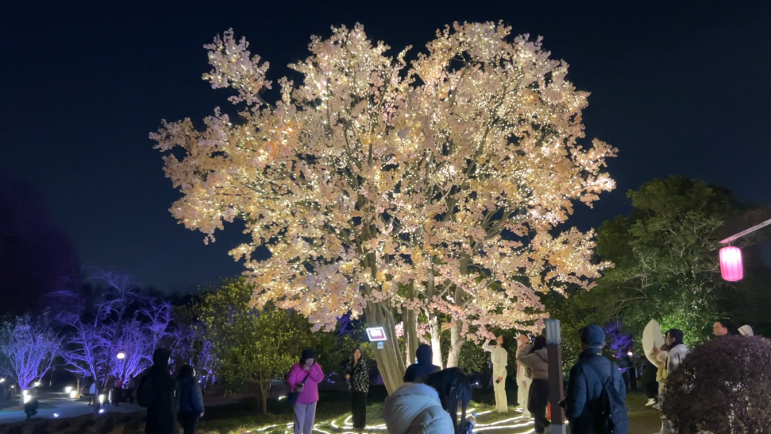 在樱花岛的西侧,一棵高约8米的“樱神树”,吸引着众多游客拍照打卡,市民张女士说,这次专门来看夜樱专场,拍出了自己满意的照片,感觉不虚此行。