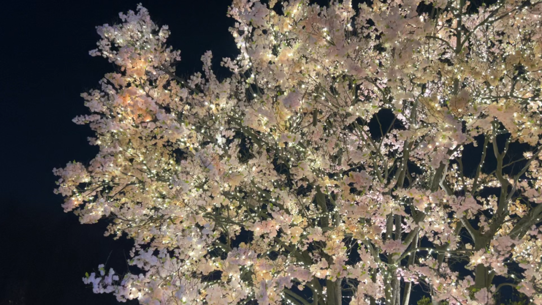 “整棵树以白色和粉色的花苞为主,用仿真花+灯光的形式去打造的,呈现出唯美浪漫的意境。我们所说的‘蝶恋樱’故事,‘樱神树’就是它的具象化呈现。这棵树非常出片,每个人在这里都可以拍到人生照片。”