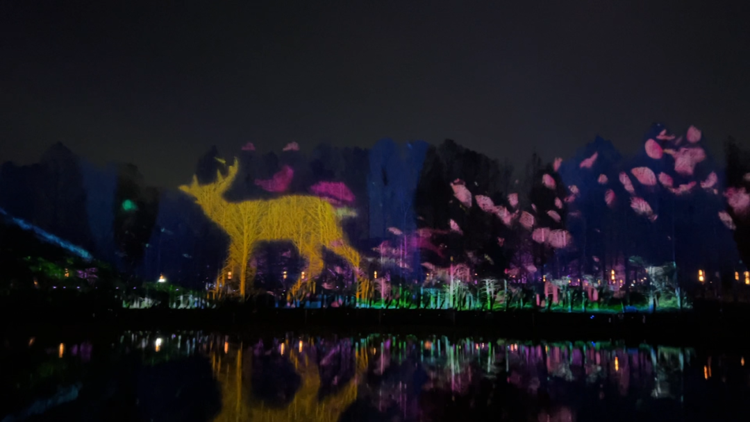 在闵行住的蔡女士,专程来到顾村公园看首次开放的夜樱专场,与朋友在樱花树下拍照留念。年轻上班族结伴体验“下班后的樱花约会”,而亲子家庭则聚焦夜樱光影秀中的“动物森林”。林间麋鹿穿梭、彩蝶振翅的3D投影特效,配合环绕式音乐与花香,营造出连接现实与幻想的“二次元入口”。夜樱项目策划师张耀元表示,现场利用湖面倒影和环绕式杉树林实现五维沉浸式体验,为游客提供独特的夜赏樱花体验。