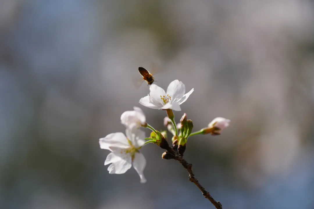 樱花苑内,多种樱花品种争奇斗艳,染井吉野樱、大岛樱、晚樱等竞相开放,枝头花朵簇拥成团,白色与粉色的樱花如云似霞,将公园装点得美轮美奂。成群的蜜蜂在花蕊间忙碌地采蜜,嗡嗡声宛若一曲曲欢快的乐章。不少市民趁着这春和景明的好时光,纷纷赶来长风公园赏花。