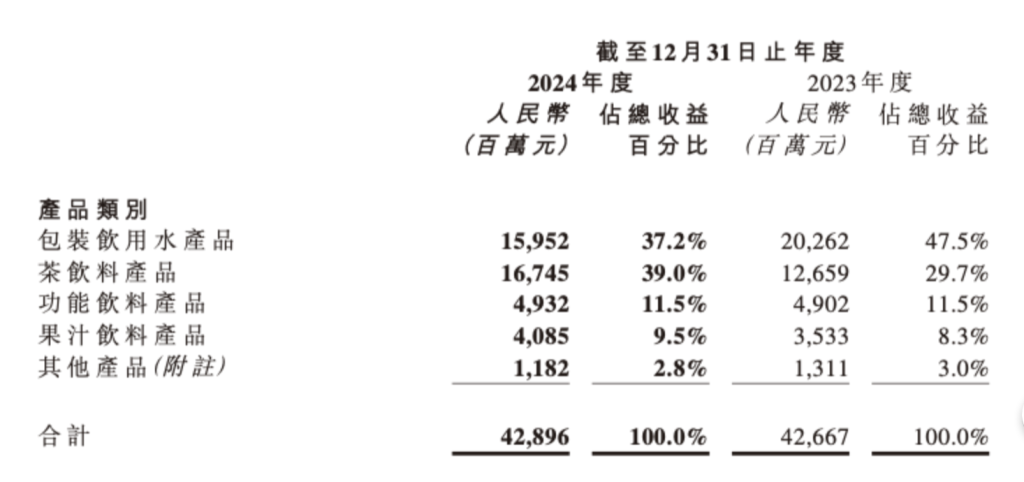 农夫山泉的产品分为包装饮用水、茶饮料、功能饮料、果汁饮料产品及其他。财报显示,2024年,包装饮用水产品的收益为159.52亿元,较去年同期下降21.3%,占总收益的比例为37.2%,2023年则为47.5%。