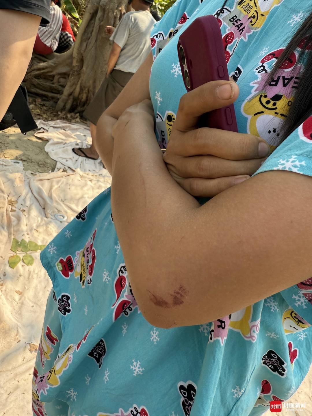 薇薇的手臂在逃生时多处擦伤