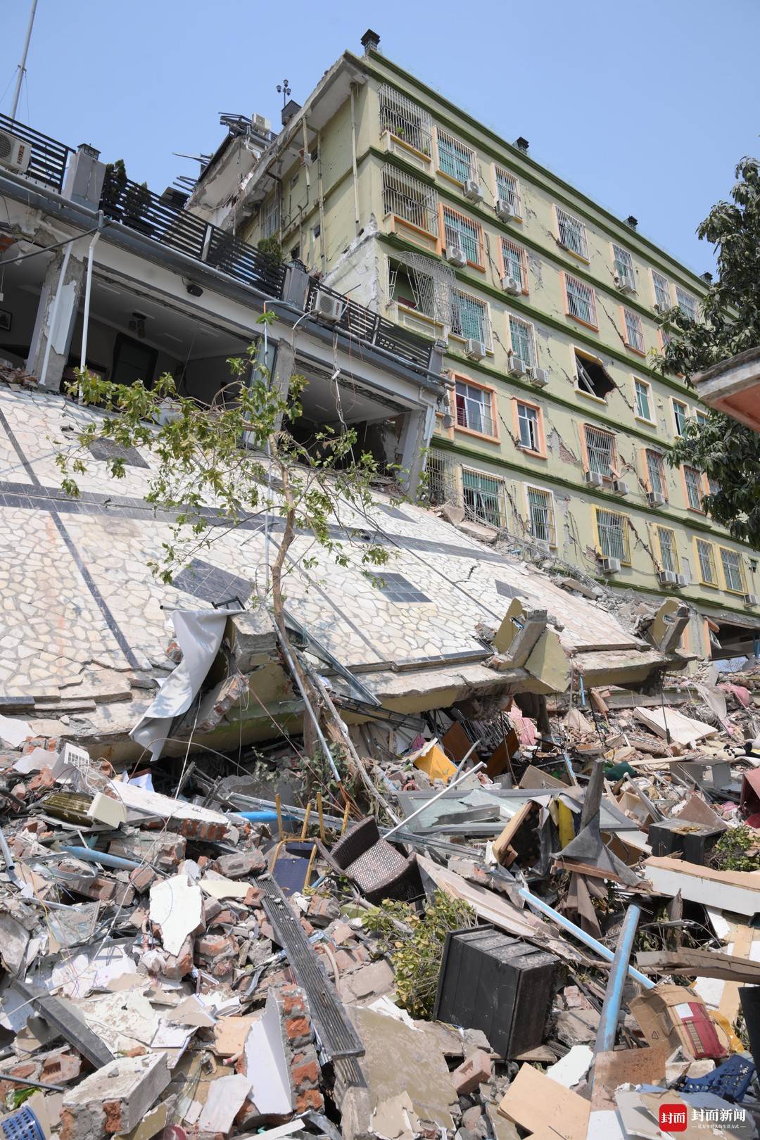3月30日,在地震中倒塌的天空别墅公寓。