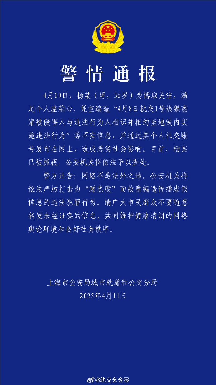 网传上海地铁猥亵事件系当事双方策划?4月11日,澎湃新闻记者从上海市公安局城市轨道和公交分局获悉,4月10日,杨某(男,36岁)为博取关注,满足个人虚荣心,凭空编造“4月8日轨交1号线猥亵案被侵害人与违法行为人相识并相约至地铁内实施违法行为”等不实信息,并通过其个人社交账号发布在网上,造成恶劣社会影响。目前,杨某已被抓获,公安机关将依法予以查处。