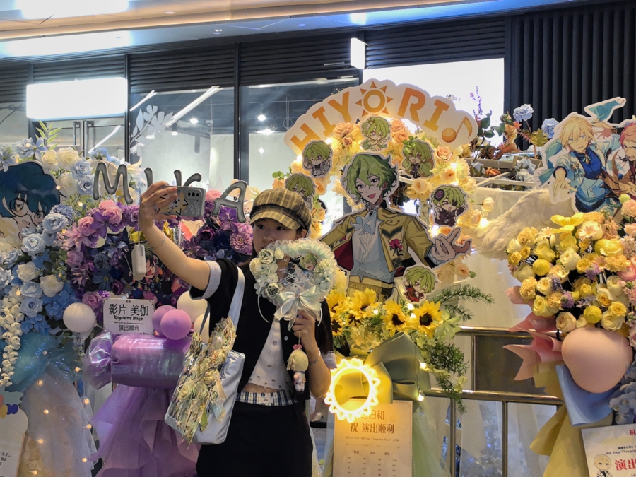 夜幕降临,静安区金融街融悦中心的街道两旁花团锦簇,各种造型别致的花丛点缀着帅气的二次元角色立牌,吸引了路人拍照打卡。这些都是游戏《偶像梦幻祭2》玩家自发准备的“祝花”,祝贺4月11日晚《偶像梦幻祭2》虚拟演唱会DREAM LIVE-9th Tour“Trapezium Orion”-上海站(以下简称DL9)在中心三楼的上海蜚声LiveHouse举行。