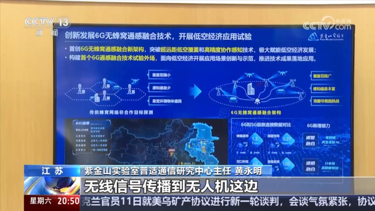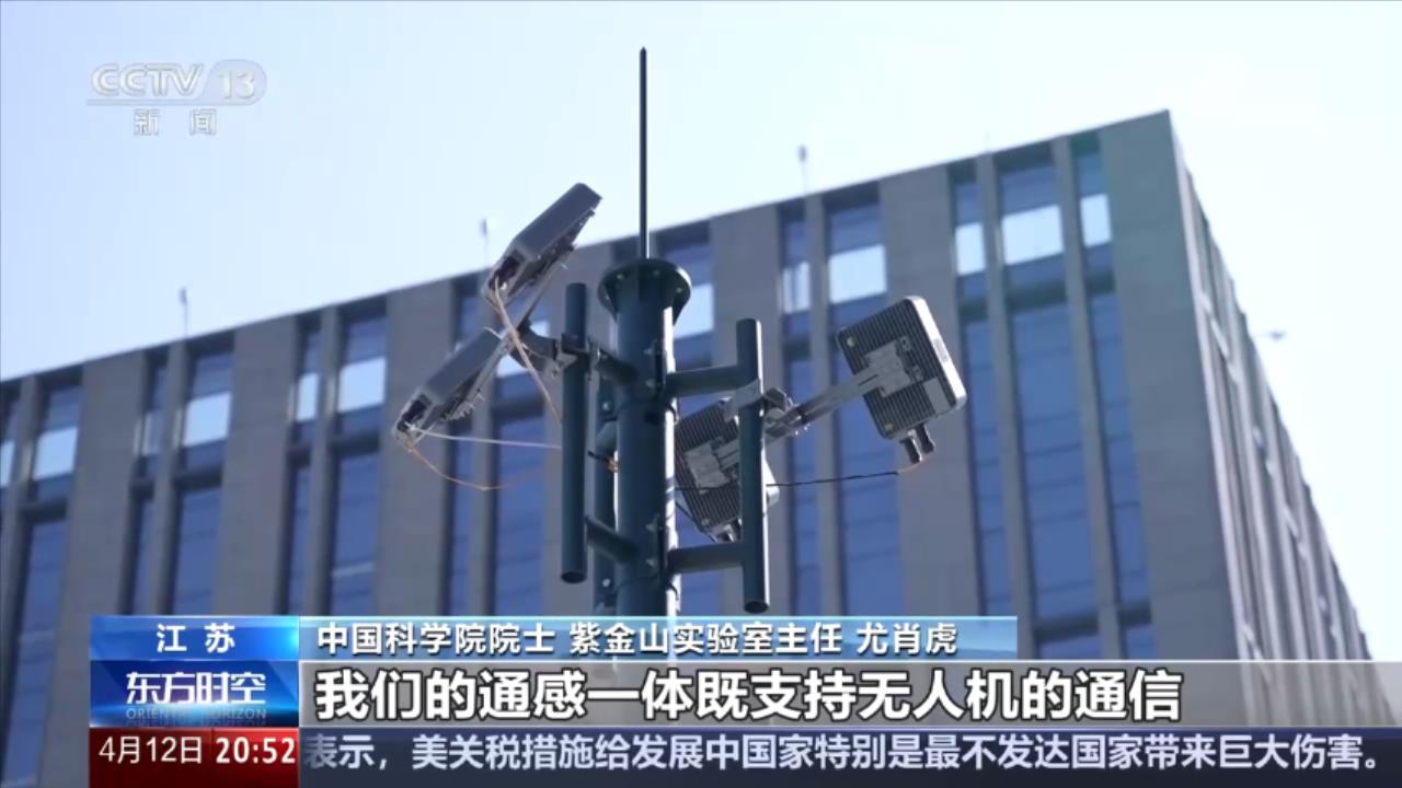 中国科学院院士、紫金山实验室主任 尤肖虎:在未来的一些新兴领域有非常重要的应用前景,比如,无人机,在无人机飞行的同时,既要和它进行通信,又要能够感知到无人机,特别是一些非法飞行的无人机,飞到某个区域内,要能够感知到它,所以,我们就可以用通感一体,既支持无人机的通信,又可以支持无人机的感知。