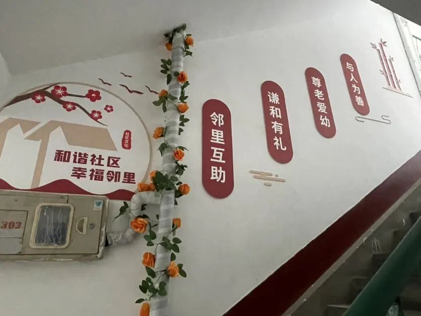 除了加装电梯,居民们还发挥所长对楼道进行了改造,与普通楼道改造不同,这里创新采用“一层一主题”的设计理念,让每个楼层都成为独特的文化展示空间:有摆放十字绣“家和万事兴”的和谐邻里层,有“二十四节气”文化层,还有孩童们涂鸦装点的童趣层,让原本单调的楼道变成了居民交流、学习的温馨空间。