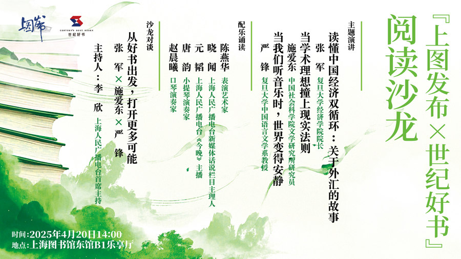 4月20日,第五期精选榜发布会暨“上图发布×世纪好书”阅读沙龙将现场发布世界读书日特别书单作品23种,邀请张军、施爱东、严锋等重磅作者、专家评委围绕经济生活、学术发展、音乐文化等广大读者关注的热点话题进行主旨演讲与沙龙对谈,并首发新书《世纪好书:2022-2024》。