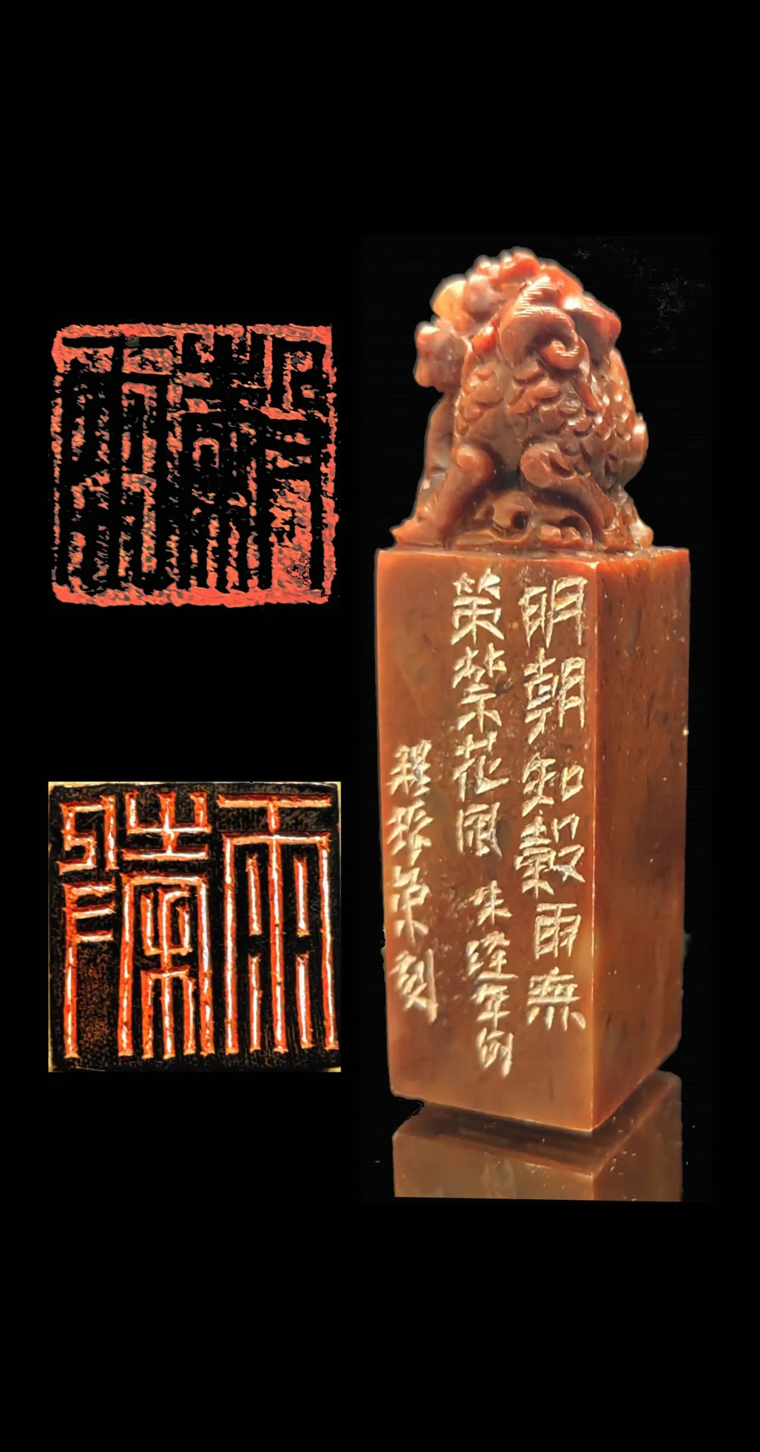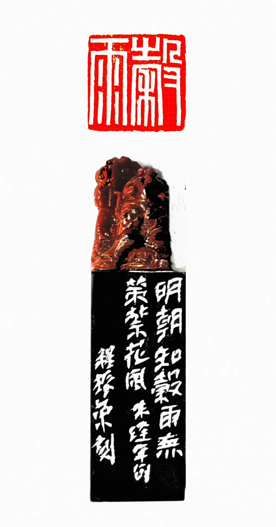 印石材质选用狮钮寿山石,其质地温润、色彩明艳,为印章增添了独特的艺术美感和观赏价值。