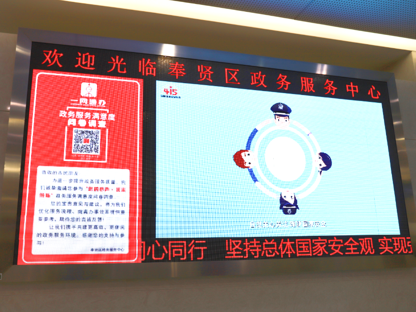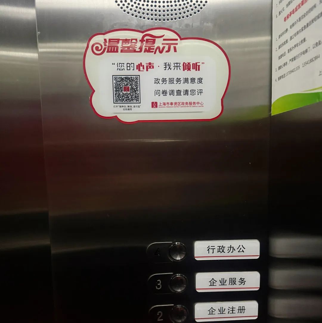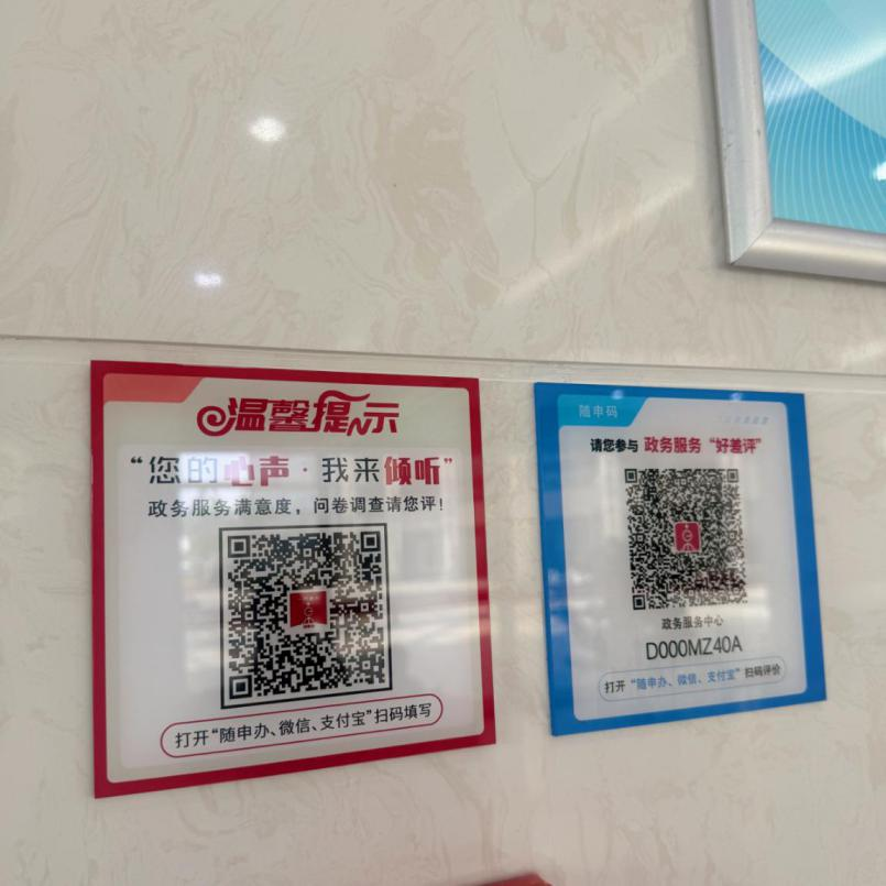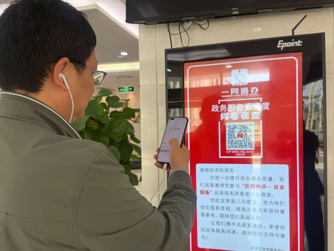 区政务服务中心各办证大厅、电梯间等公共区域均设置满意度调查二维码,同时各大厅电子大屏、竖屏全覆盖滚动播放,市民朋友扫码即能填写!