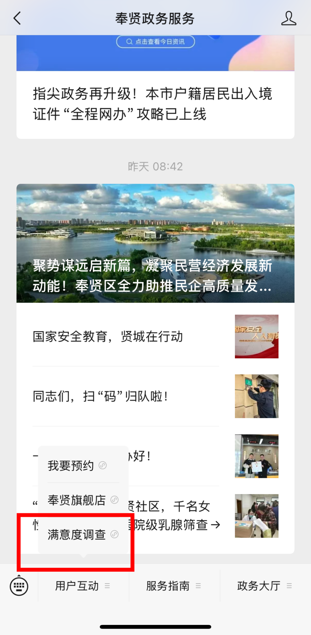 2.关注“奉贤政务服务”微信公众号,菜单栏“用户互动”中点击“满意度调查”,提交即达!