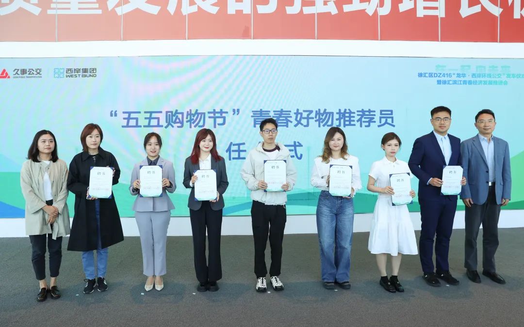 “五五购物节”青春好物推荐员聘任仪式上,由团区委及龙华街道相关领导共同为来自龙华会、西岸凤巢、传媒港花园里、西岸大剧院、西岸梦中心、工商银行徐汇支行、招商银行东安路支行的7名青年代表颁发聘书。