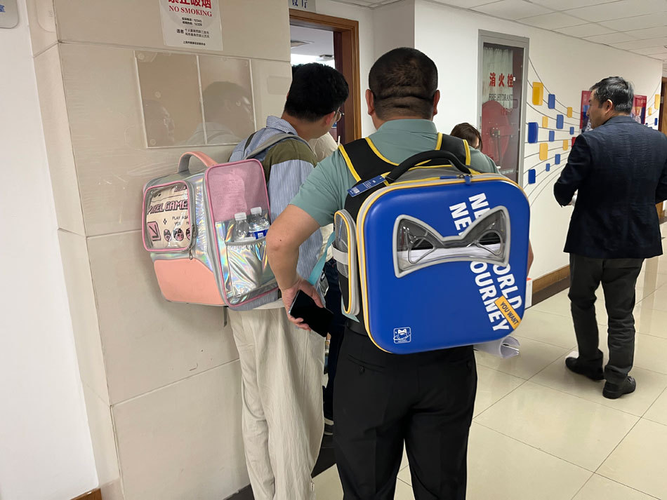 王加刚和同事背着宠物包参加对接会 本文图均为澎湃新闻记者邹娟摄