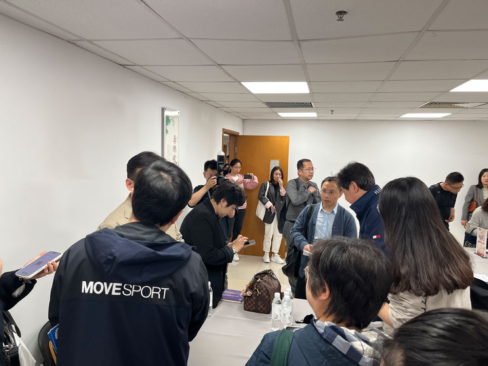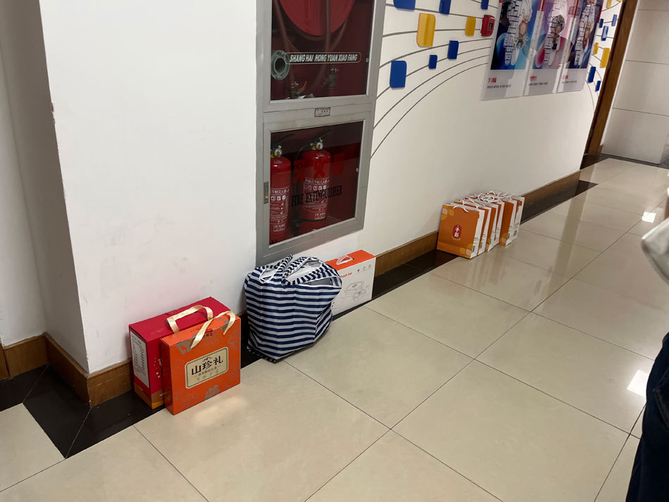 对接会政策宣讲室人太多,部分外贸企业负责人将带来的产品放在会议室外的墙角边