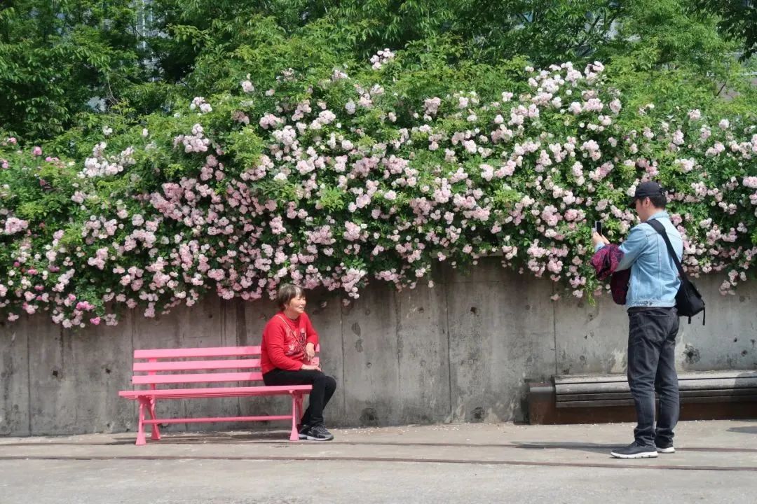 阳光穿透镂空钢筋,粉白与粉紫,双色花朵摇摆浮动,在花岗岩步道上投下一束束蔷薇花影。不少盛装而来的少女,正在想尽办法留住这份美好。