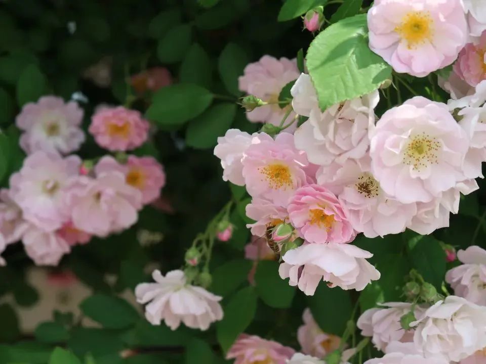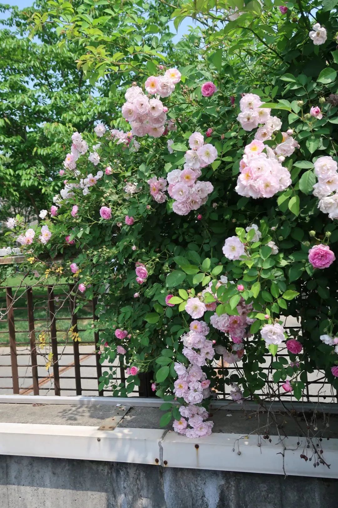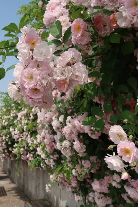与粉白相间的蔷薇花瀑撞个满怀