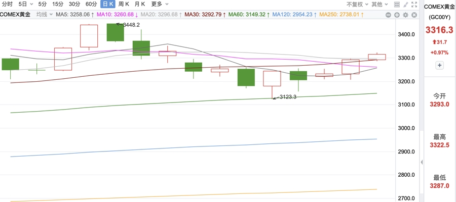 截至5月21日15点,COMEX黄金价格仍在3300美元/盎司上方。