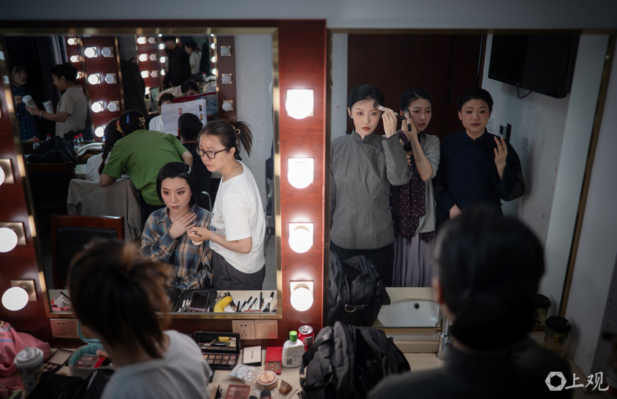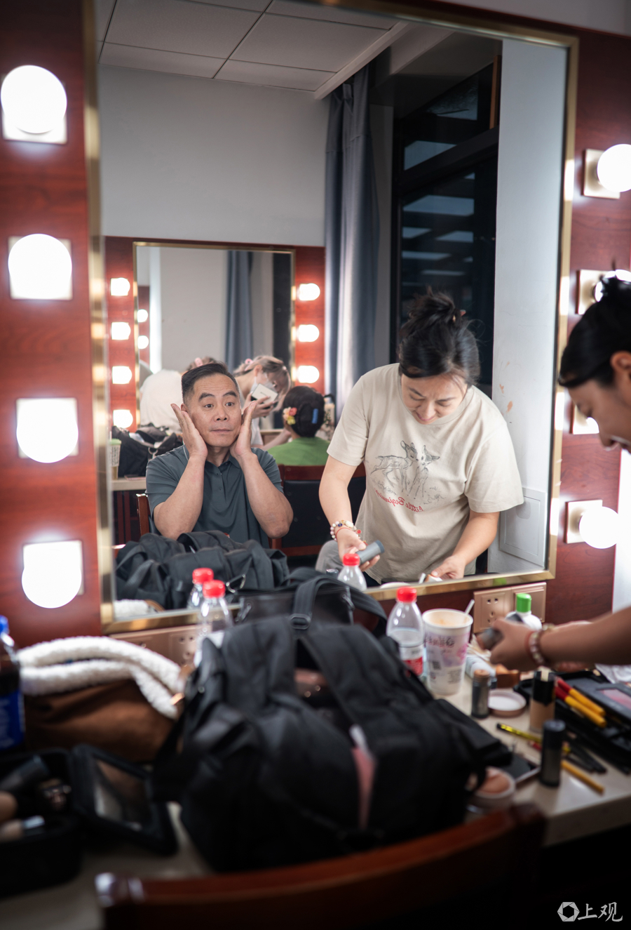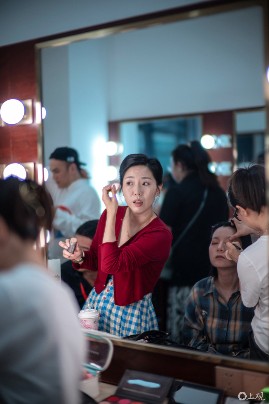 演前一个半小时,后台开始忙碌了起来,演员们轮流坐到镜前开始化妆。