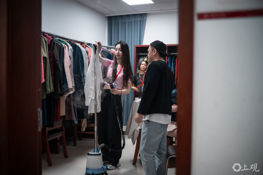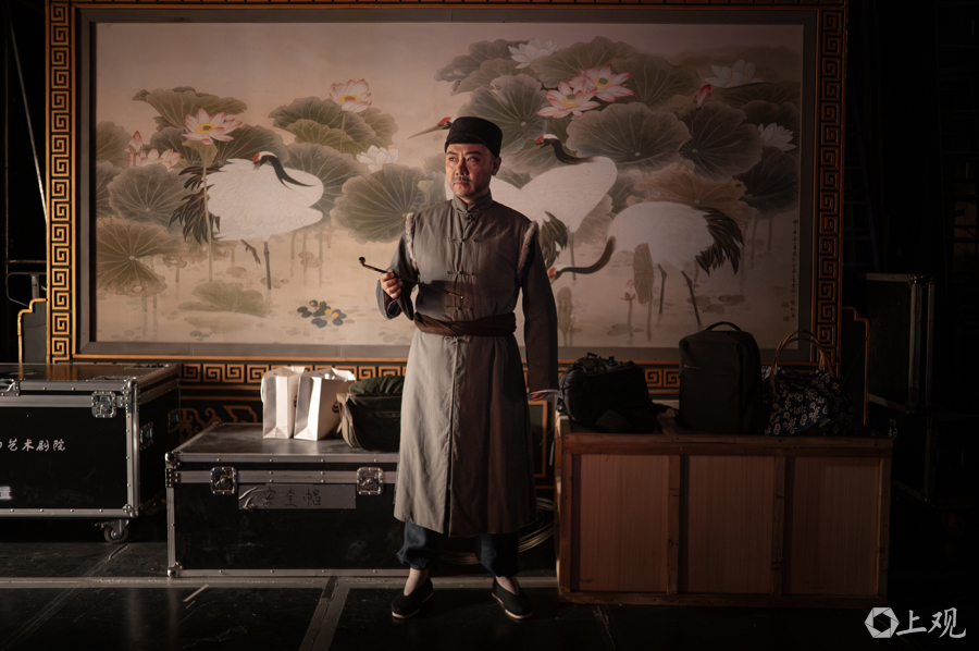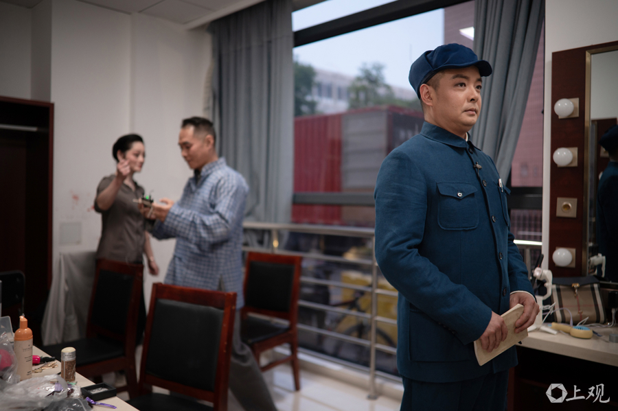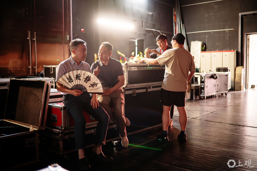 等待上台试音,在剧中饰演村长的洪立勇(左)和饰演张木匠的吴争光在台下眉飞色舞地聊着戏。这两位国家一级演员是沪剧院的大前辈。