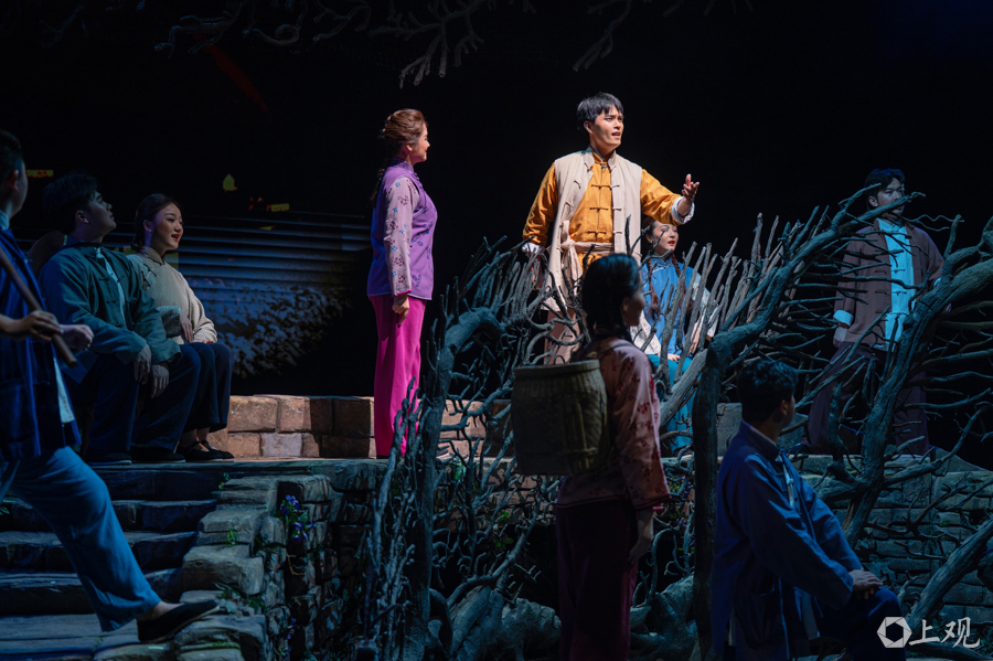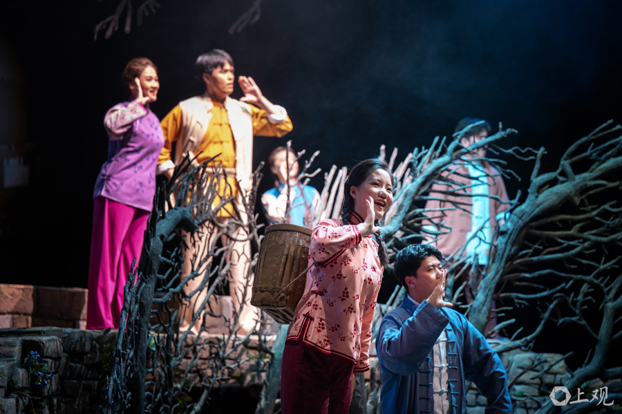 音乐设计更显匠心独运:歌队以无伴奏形式吟唱沪剧早期山歌调,空灵人声与铿锵锣鼓编织出戏剧张力。