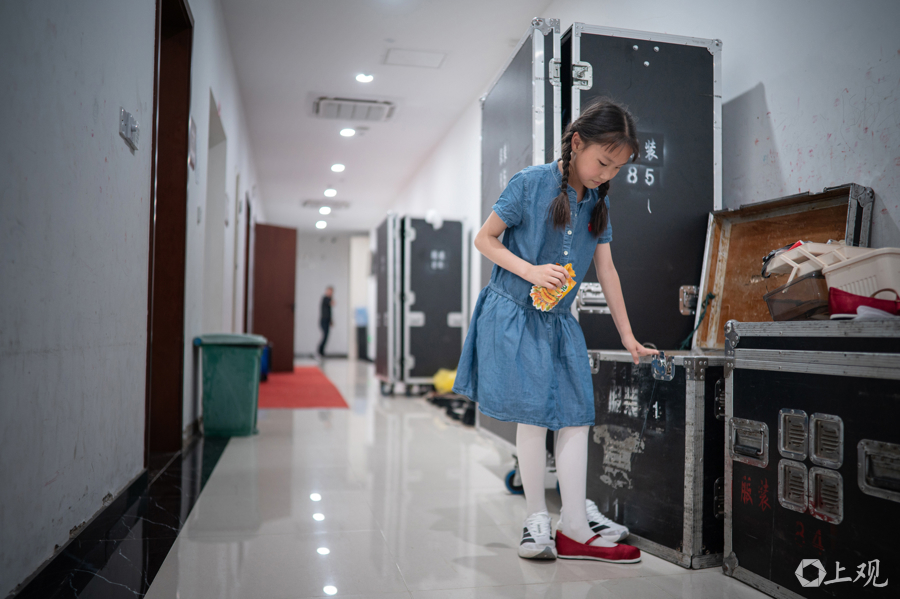 后台,剧中参演的小演员在试穿戏服配的红鞋。