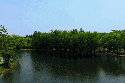 天空湛蓝,杉树青翠,碧波微漾,飞鸟声声
