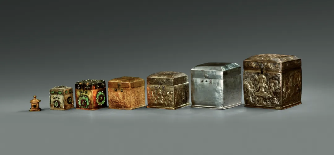 但仔细一数,1+2+2+1+1……明明是八重宝函,为何只有七件?怎么好端端少了一重呢?原来是因为最外层的檀香木银棱盝顶宝函出土时已残朽,故现今我们能见的,只有七重。所以你说它是1/7件文物,说法又双叒正确。