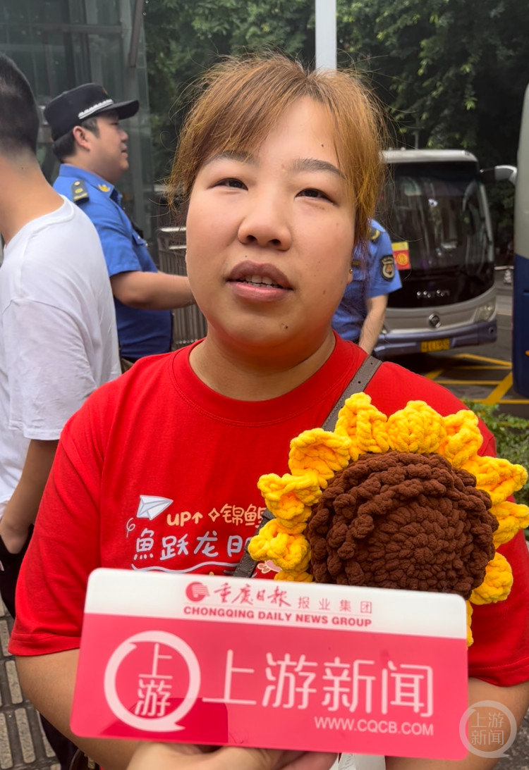 “学校统一安排车辆把孩子送到考点,所以我也只能在这里等着她来,在考试前看她一眼,为她打打气。我还专程之前自己用钩针制作了一朵大向日葵,毕竟是‘一举夺魁’,希望能够给孩子带来好运。”