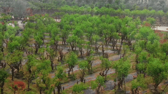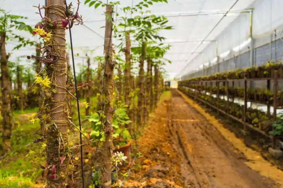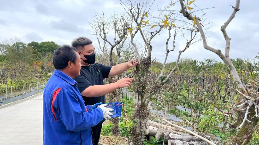 带着这份意外的惊喜,回到上海后,父子俩在自家苗圃反复试验,让石斛附生成功。为了规模化地发展石斛产业,黄贤宝与黄磊父子俩在上海遍寻宝地,最终被罗泾镇新陆村的生态环境吸引:这里是上海水资源二级保护区,水杉成林、碧水环绕,正是附生石斛生长的“天然实验室”。2021年3月,占地50亩的磊宏基地落地生根。黄贤宝与黄磊带着工人一棵棵调试树种、监测养分,终于让铁皮石斛在桃、柿、李等果树枝干上“安上家”。