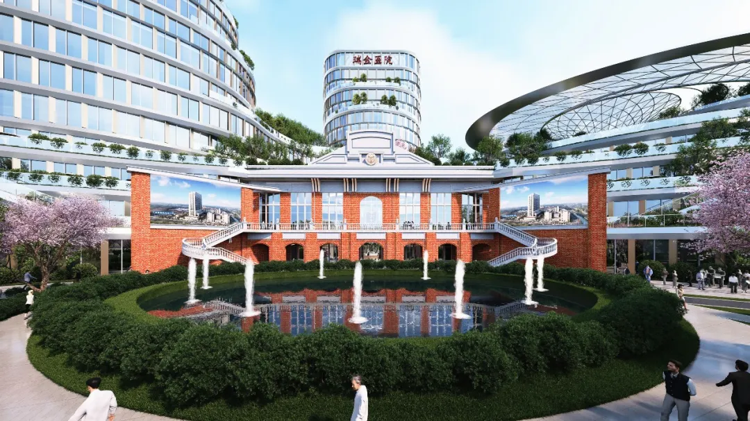 主入口的设计,巧妙嵌入瑞金医院标志性历史建筑8号楼的法式立面风貌,寓意传承与发展。另外,围绕建筑,顺势设置景观水系,完成绿色花园医院的营造,呈现“生命综合体,健康会客厅”的规划构想。