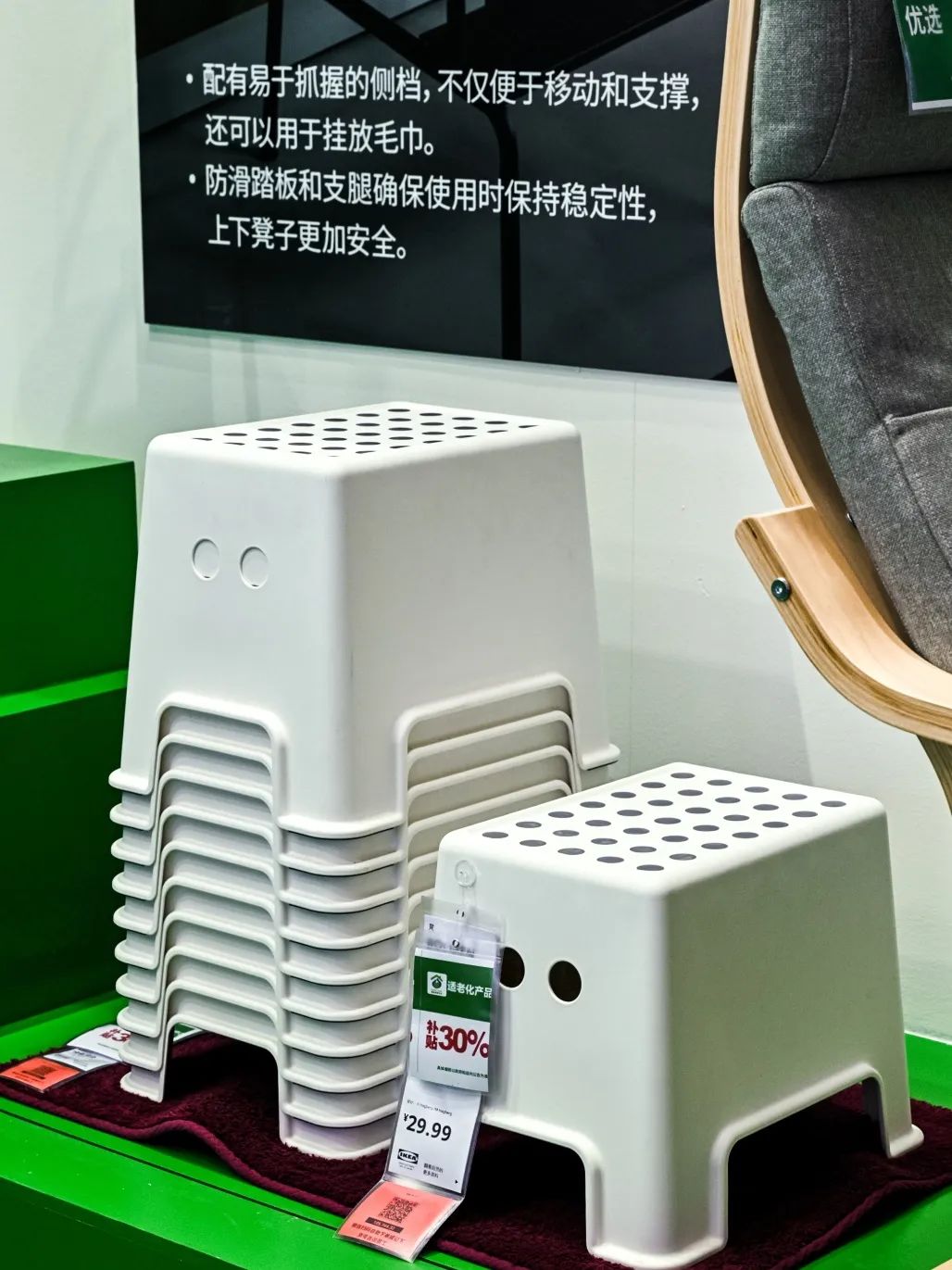 现场还陈列了宜家4月新品巴辛根系列,带扶手的踏脚凳、淋浴凳等产品,采用柔和圆角等包容性设计,具备防滑底部支脚和排水孔,尺寸便于舒适握持,功能多样、坚固耐用,是浴室场景的理想选择。