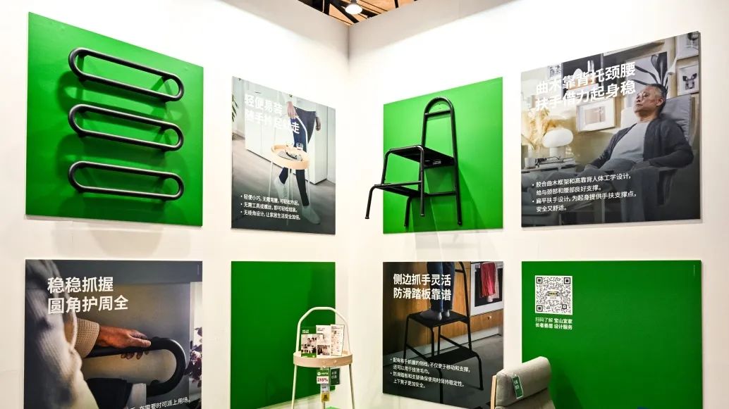 宜家上海的老博会展位,提供了富有启发性且实惠的家居解决方案。“适老化”是一大特色,以客厅场景为核心,各类适老化产品巧妙融入。