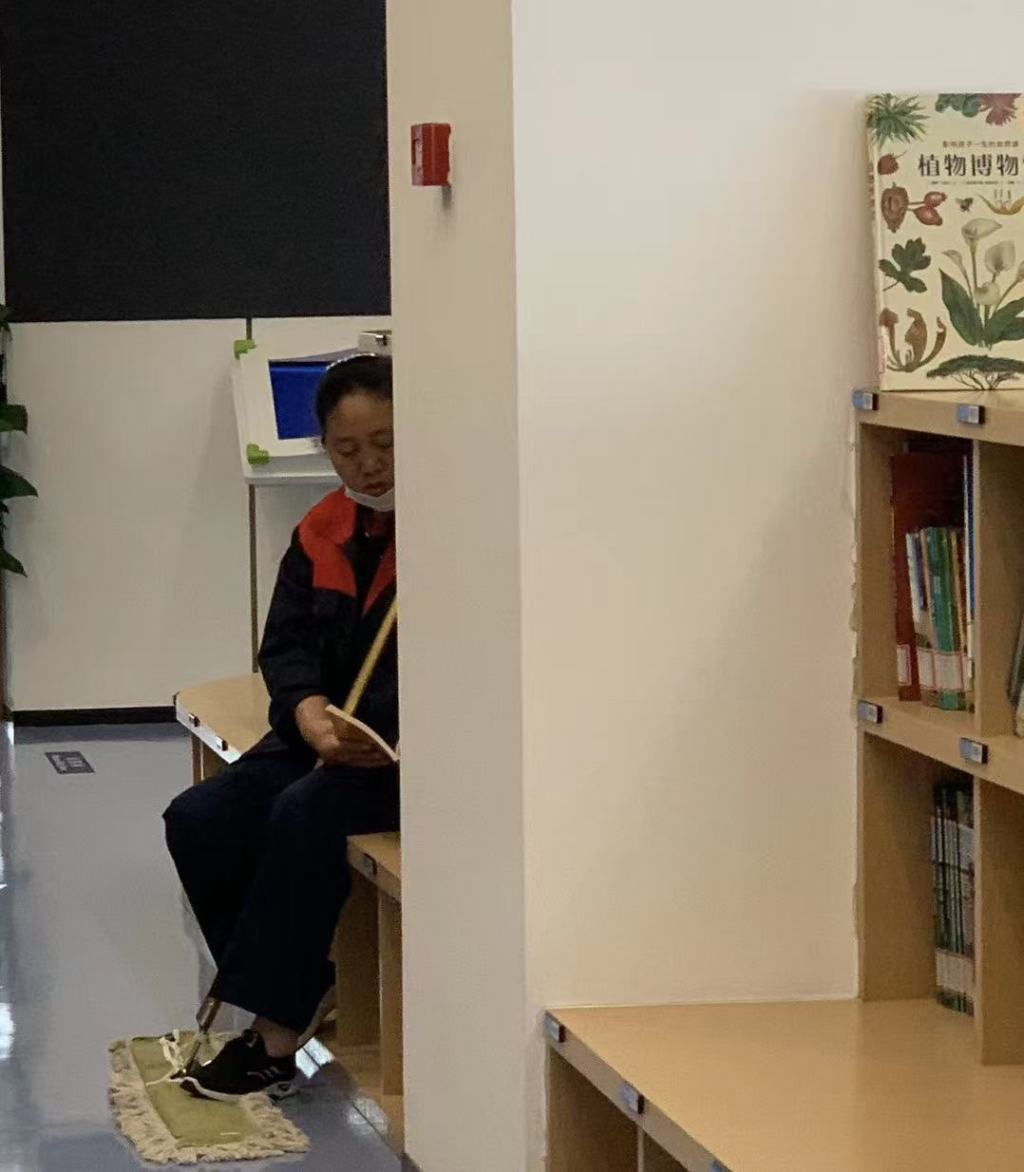 第五张照片是保洁阿姨的“无声课堂”。2020年5月20日中午,忙碌完的保洁阿姨坐在学习资源中心,轻轻靠着柱子专注读书。抓拍到这一瞬间的卢慧文总校长在朋友圈写道:“这是孩子们的好榜样,我蹑手蹑脚走过去,生怕惊动了她。”