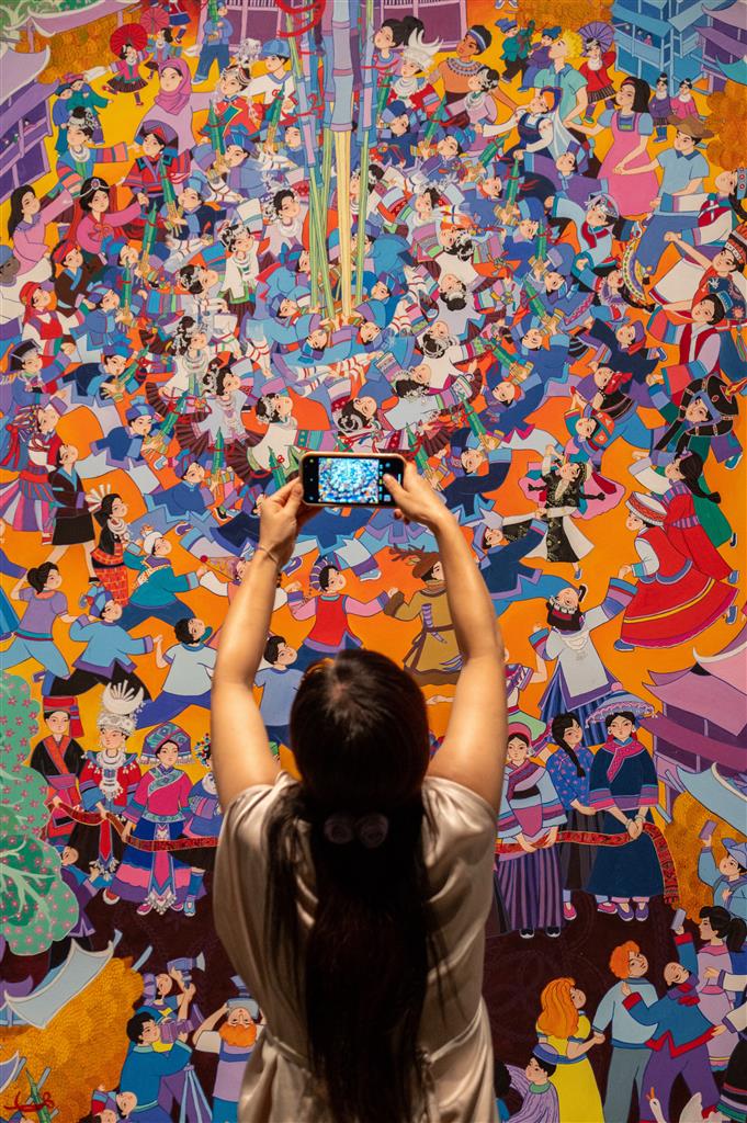 在展览现场,来自新疆的作品《婚庆麦西热甫》颜色鲜艳,风格强烈,吸引了许多观众。“麦西热甫就像是聚会一样,”主创之一、喀什地区文联民间文艺家协会常务副主席米那瓦儿·木台力甫向东方网记者介绍,这幅作品耗时一个月,内容集合多项民族活动、多种非物质文化遗产。比如画面中间是集歌、舞、乐于一体的大型综合艺术——刀郎木卡姆,其中,音色清亮似古筝、形制近似扬琴、史称“七十二弦琵琶”的卡龙琴亦是非遗瑰宝。画面左侧的“叼羊”活动被誉为“骑士之战”,比赛扣人心弦,气氛热烈非凡。3.5米×2.8米的画卷上将新疆传统婚礼风俗展现得淋漓尽致,驻足欣赏的观众仿佛身临其境,耳边似乎传来阵阵欢歌乐曲,身子也不由随之舞动起来。