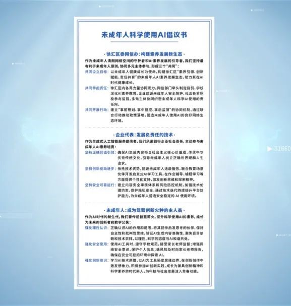 徐汇区首创发布的《未成年人科学使用AI倡议书》提出,政府部门要坚持最有利于未成年人原则,协同多元主体参与,努力构建“素养引领、创新赋能、责任共育”的未成年人AI素养发展生态,助力其在AI时代健康成长。提供生成式人工智能服务的企业要坚持正确价值引领,依托技术优势,建立内容安全审核体系和风险防控机制,主动参与未成年人AI素养培育,为未成年人营造安全稳定的 AI 使用环境。作为AI时代的新生代,青少年要强化对AI技术的理性认识、安全使用和创新意识,提升科学使用AI的综合素养,努力成长为具有科学素养的数字公民。