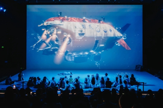 全新主题《蔚蓝归途》是聚焦深海的沉浸式作品,关乎中国深潜事业的最新成果“蛟龙号”。创作团队邀请到“蛟龙号”副总设计师崔维成教授担任科学顾问,将万米深潜的核心科研数据、海底地质样本分析、深潜器技术突破等第一手资料,转化为可感知的视觉语言。观众在体验中可以“跟随”深潜器穿越马里亚纳海沟的漆黑深渊,看到发光生物的奇幻,也感受中国深海探测从“跟跑”到“领跑”的科技进步。