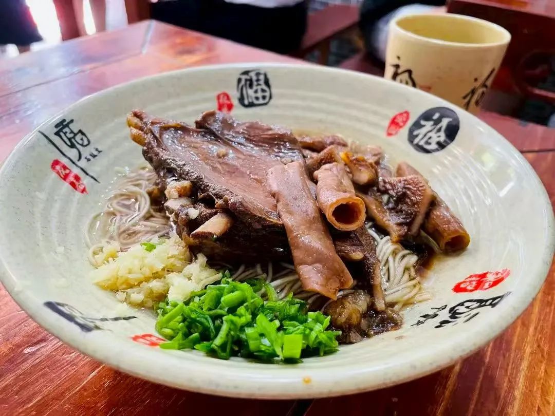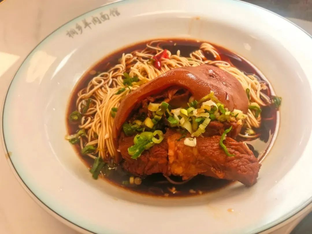 一进门,就能看见一口大锅,正炖着当天现烧的羊肉。懂行的、讲究的客人,会直接指着锅里,让老板切自己想要的那块肉。这里的羊肉用的是湖州山羊,肉特别嫩,没什么膻味,块块都鲜嫩好吃。配上店里特制的碱水细面,这面条容易吸汤,口感又筋道,吃着特别香。最后再喝上几口热乎乎的羊肉汤,那才叫心满意足。