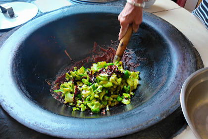 “做酱瓜最重要的就是炒酱这一步,锅热后先放入姜末、小米辣炒出香味,再加入冰糖、生抽和少许老抽,这样做出来的才好吃。”张阿姨不断翻炒,直至每根瓜条都裹上均匀的酱汁。