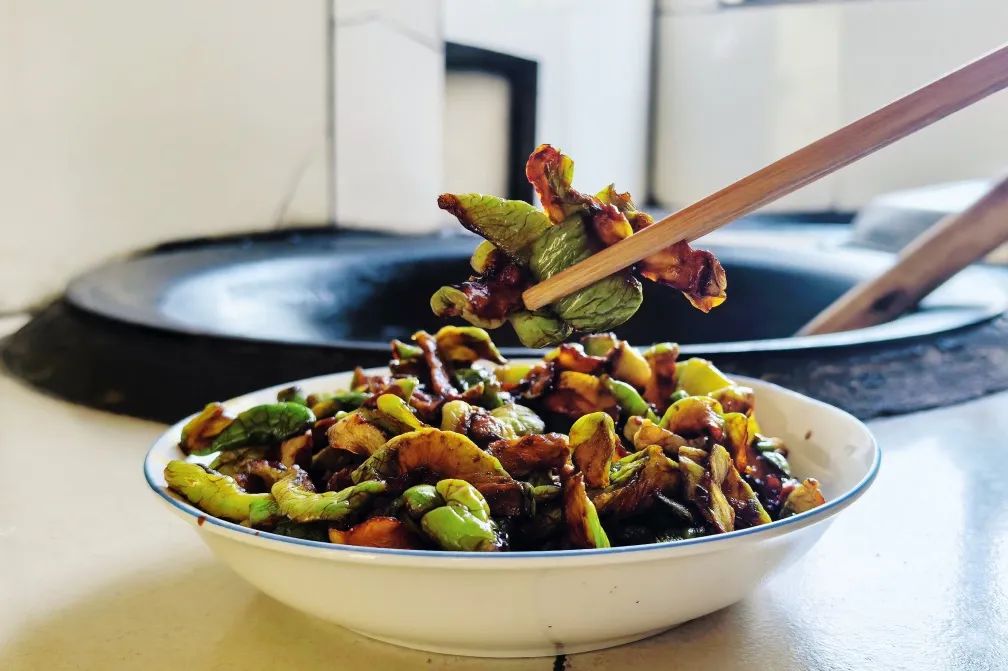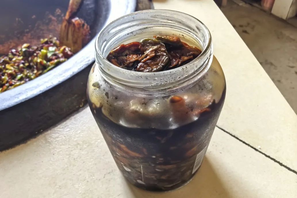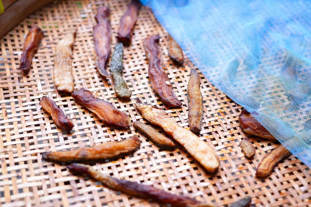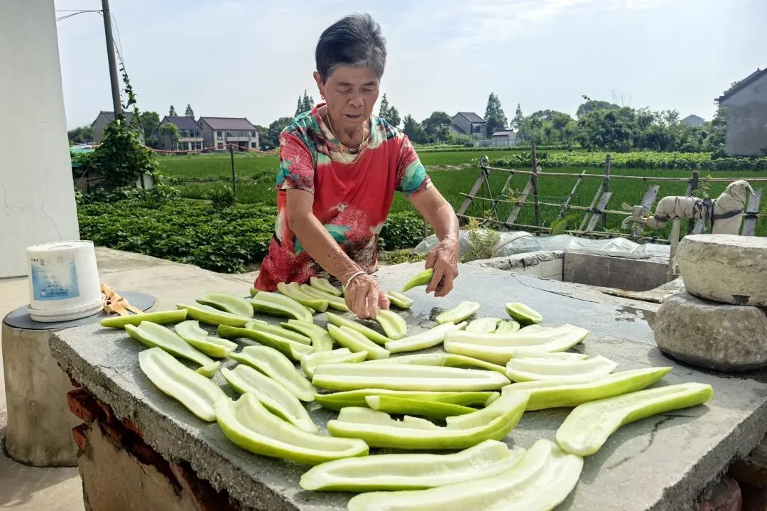 炒好的酱瓜摊在竹匾里,端到向阳处晒两天,就能品尝到爽脆下饭的酱瓜了。“晒好之后直接吃就很爽口,配粥或者下饭都很合适。”张阿姨拿起一根尝了尝,又说,“要是想换个花样,切点毛豆一起炒,那样味道更好。”