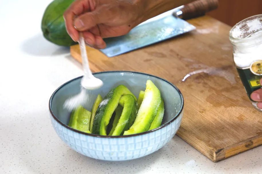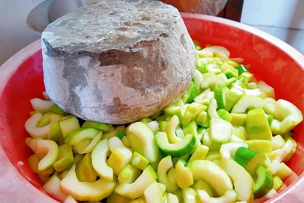 生瓜洗净后,用勺子挖去内里的瓜籽,冲洗干净后放在通风处晾晒半天。接着将生瓜切断后撒上适量食盐,用重物压实静置一夜,期间每隔几小时翻搅一次,让盐分均匀渗入每一寸瓜肉。