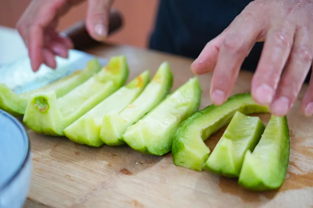 摘到满意的菜瓜后,张阿姨先将菜瓜仔细冲洗干净,再逐个对半切开,用小勺挖去中间的瓜籽和软瓤。处理好的菜瓜被均匀切成长条状,撒上适量食盐后,反复揉抓、挤压,去除菜瓜内多余的水分。
