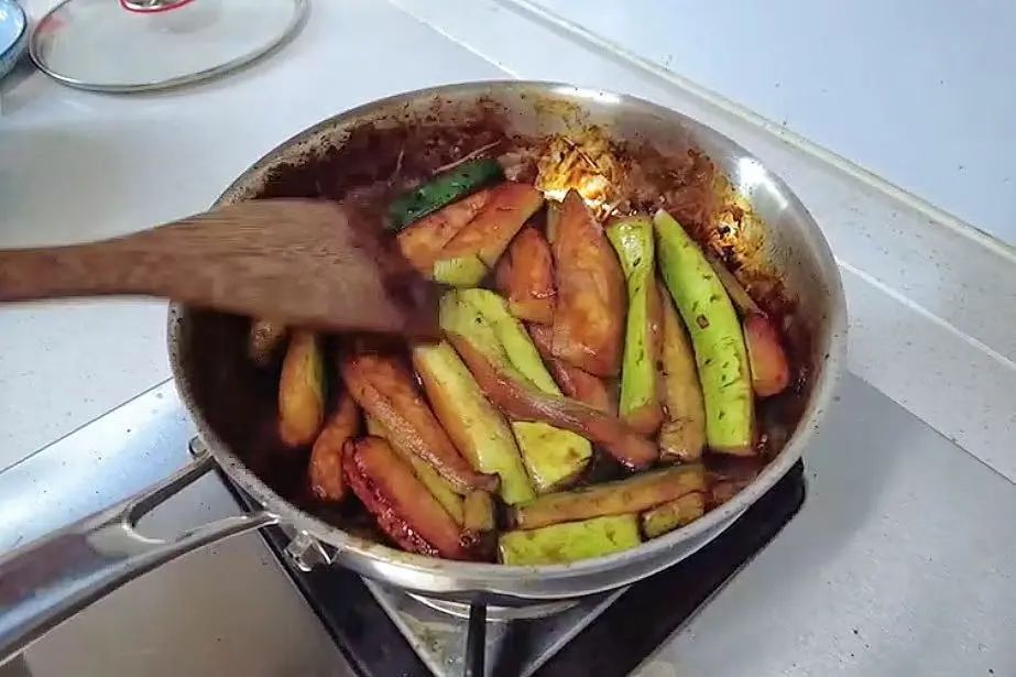调酱汁时,先放入适量冰糖和少许白糖,白糖易焦化增香,冰糖则带来温润清甜,二者搭配恰到好处。再倒入生抽提鲜、老抽上色,小火加热翻炒至糖粒融化,酱汁泛起细密的泡沫。最后把生瓜倒入酱汁中,轻柔翻拌让每一片瓜都裹满浓郁的酱汁,咸香中带着丝丝回甘。