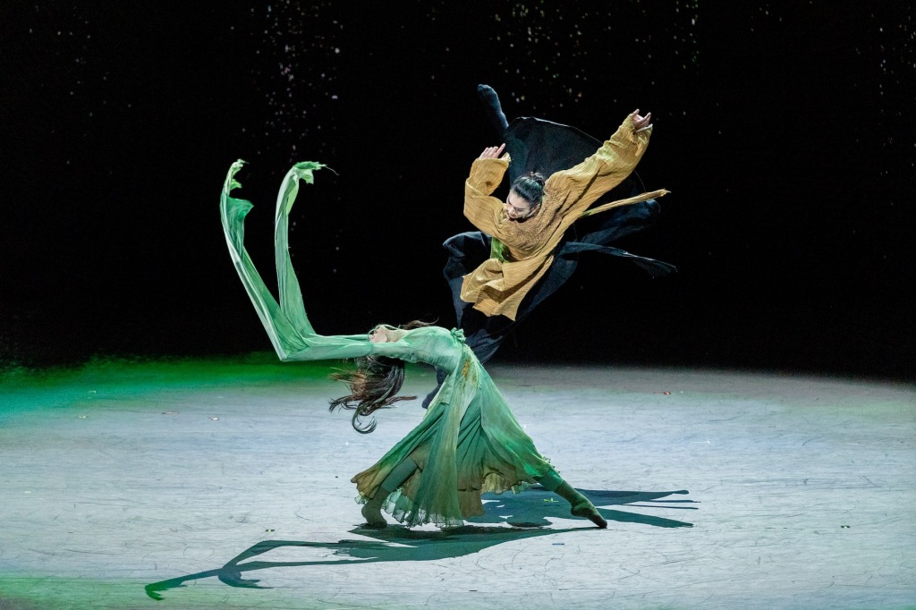 “雨中情挑”再现了白蛇、许仙断桥相会的桥段,油纸伞抛接之间,带有东方韵味的芭蕾足尖舞步缓缓流淌。“蛇僧斗法”展现了法海和小青的决斗,水袖翻飞中展现中国古典舞的力量与灵动。