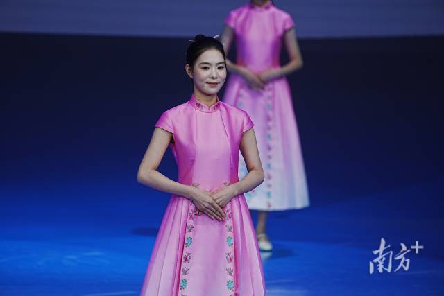 此外,衣服的整体颜色以粉色为主,象征着希望、青春和活力。单一色彩深浅渐变的应用在于让服装整体更显时尚和高级,给人一种流动和变化的美感。“我们也希望颁奖的时候,在礼仪小姐跟运动健儿同框的时候,这样一个纯粹单一的色调,不夺运动员的风采,把主角的位置让给运动员,更好地展现他们的精神面貌。”