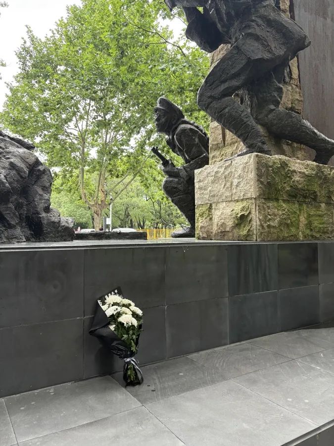 上海淞沪抗战纪念公园,肃穆安宁,绿意盎然。一束洁白的鲜花静静依偎在《历史之门》雕塑的基座旁,花束包装上印着四个字:追思先辈。