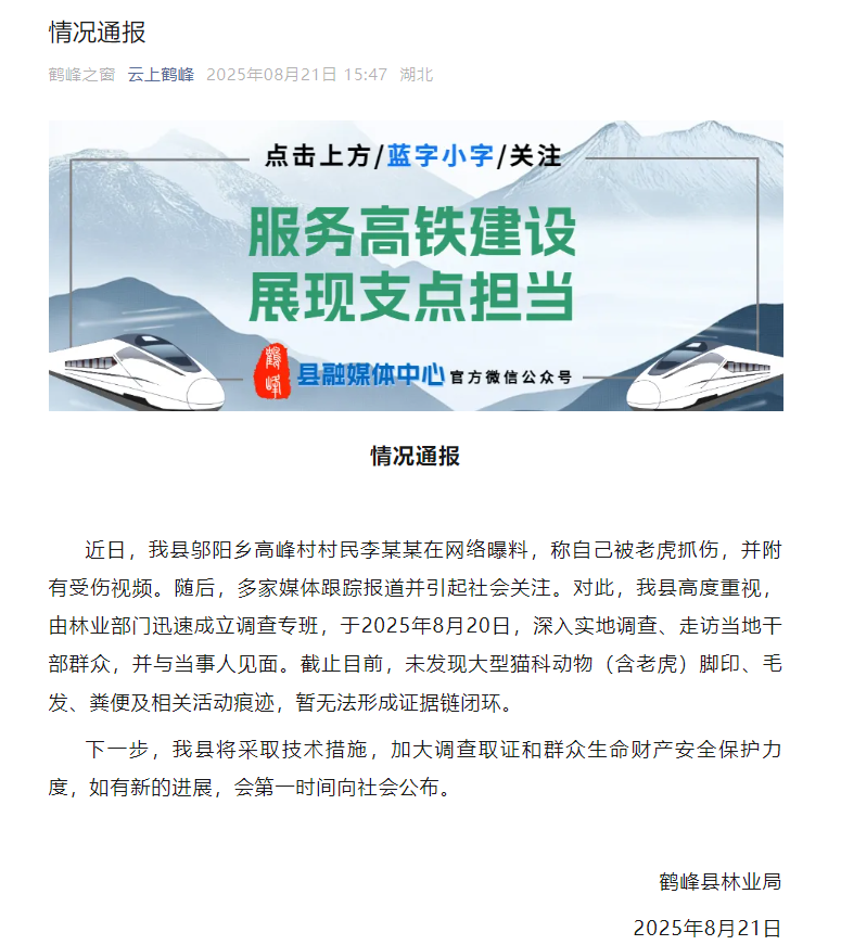 8月21日下午,鹤峰官方人士回应上游新闻记者,已排除是猫科动物抓伤了李先生。此后,官方通报称,未发现大型猫科动物(含老虎)脚印、毛发、粪便及相关活动痕迹,暂无法形成证据链闭环。