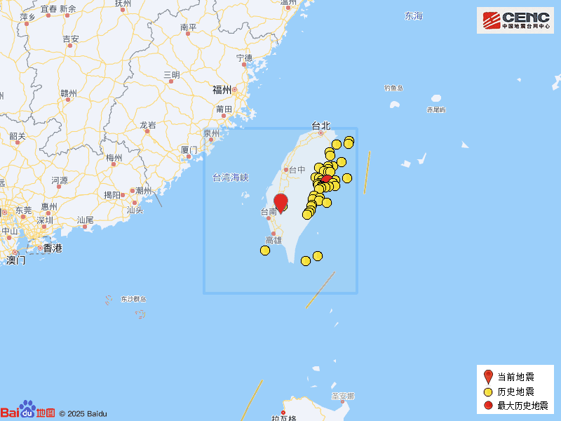 历史地震:根据中国地震台网速报目录,震中周边200公里内近5年来发生4级以上地震共360次,最大地震是2024年4月3日在台湾花莲县海域发生的7.3级地震(距离本次震中143公里),按震级大小前50次历史地震分布如图。