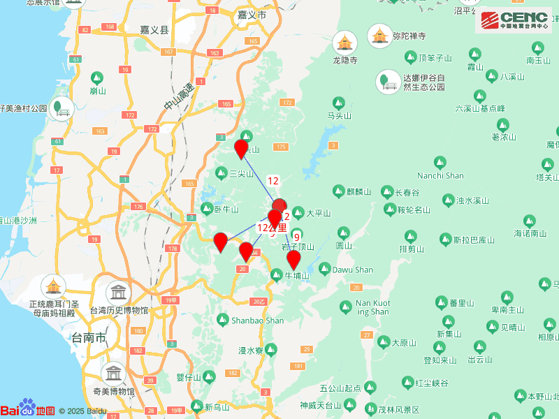 周边县城:震中距楠西区2公里、距南化区9公里、距玉井区9公里、距东山区12公里、距大内区12公里,距嘉义市33公里,距台北市232公里。